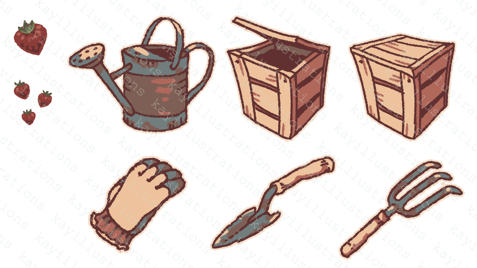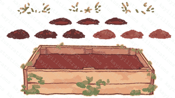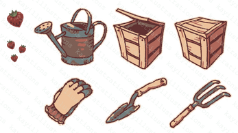 | Progress Bars Watering Temperature Brown/White Glove Open/Closed Cursors Glove Open Glove Closes Pointer Brown Pointer Red Pointer Blue Arrows Brown/White Panels Brown Calendar Circles Brown/White White Square White "Back" Arrow | Particles "Okay" "Nice" Assorted Sparkle Strawberries Large Small Heart Energy Watering Can Compost Box Open Closed Glove Trowel Hand Rake | Planter Box Dirt Plots Empty Dry Wet Weeds Dead Leaf Overlays Sprouts Healthy Unhealthy Blooms Healthy Unhealthy Fruiting Blooms Healthy Unhealthy Grown Strawberries |